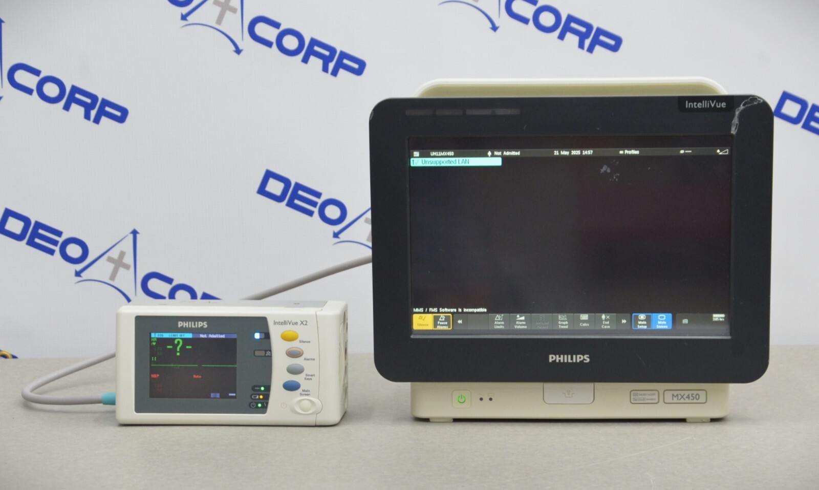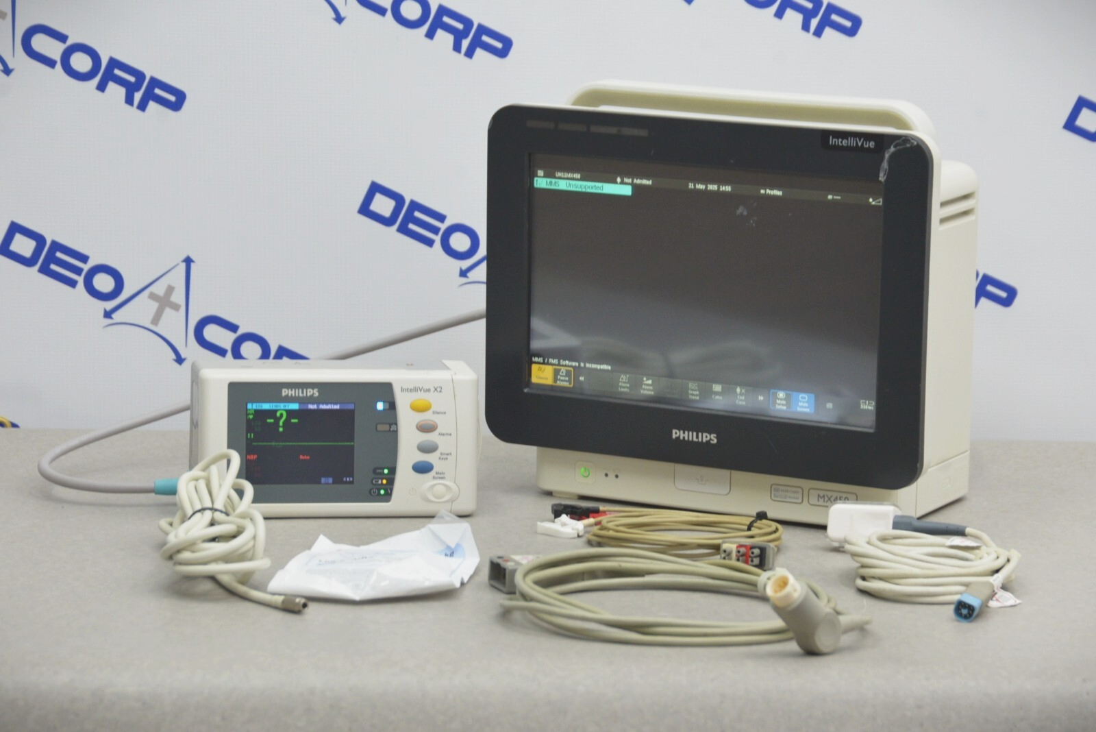 This Philips IntelliVue MX450 866062 W/ IntelliVue X2, Masimo, NiBP, 12-Lead & Temp is in great working condition. The unit powers on and the buttons respond properly. The display screen produced a clear image and the touch screen functions as intended. The batteries holds a charge. There are minor scuff marks and scrapes from previous use (see photos). This unit comes with a 30 day satisfaction guarantee. Includes everything in the pictures and nothing else.