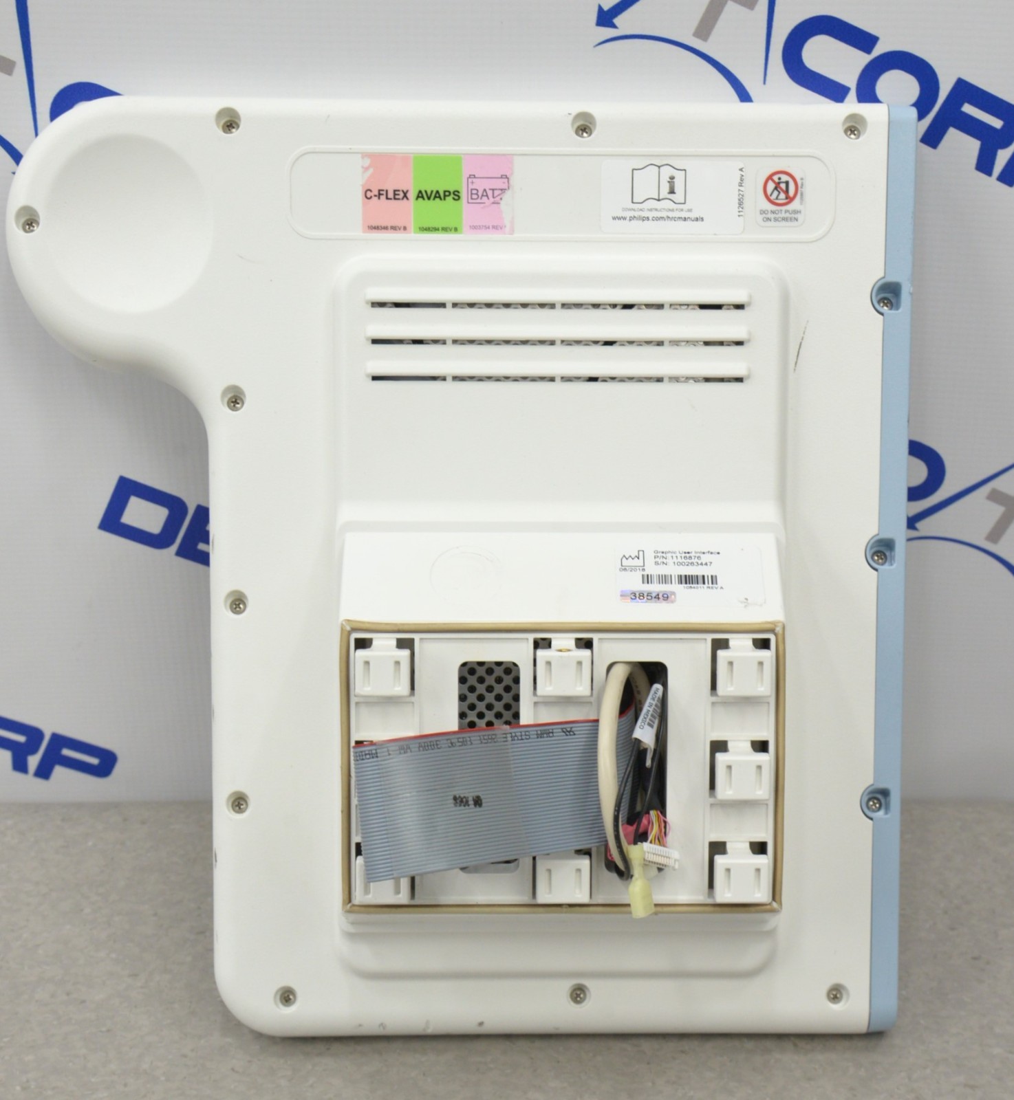 This Philips V60 Graphic User Interface Touch Screen 1116876 came from a working environment and is in good cosmetic condition. This is the screen only; therefor, we are unable to power it on, for this reason it is being sold for parts. The connections are clean and in good condition. There are minor scuff marks from previous use (see photos). Includes everything in the pictures and nothing else.