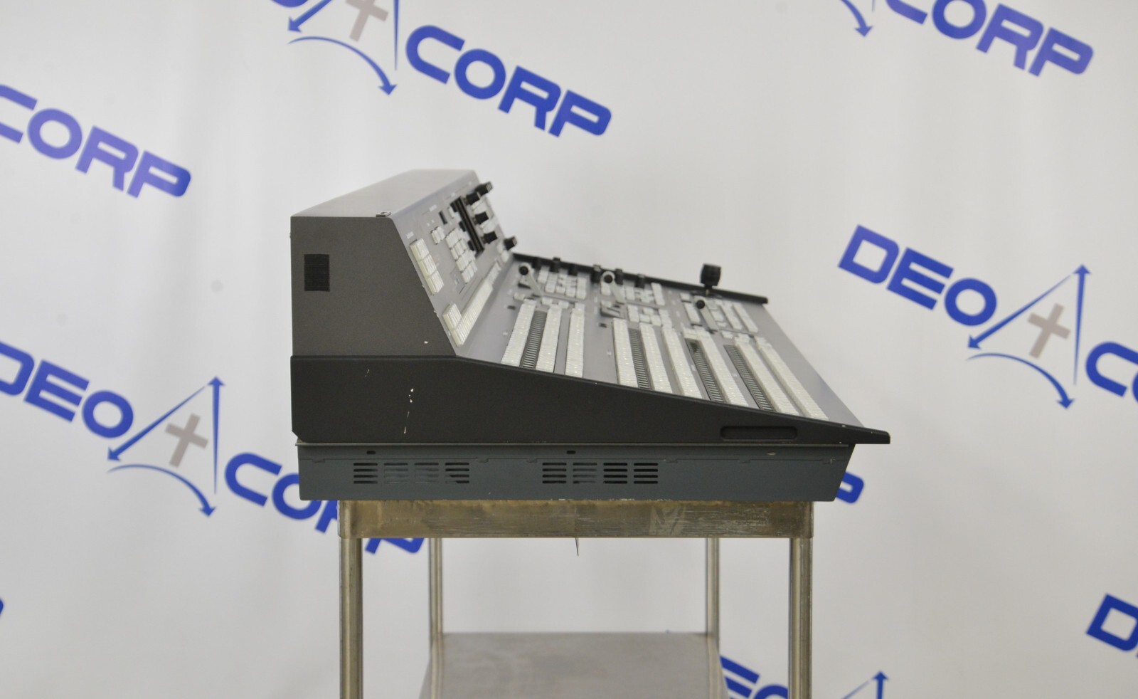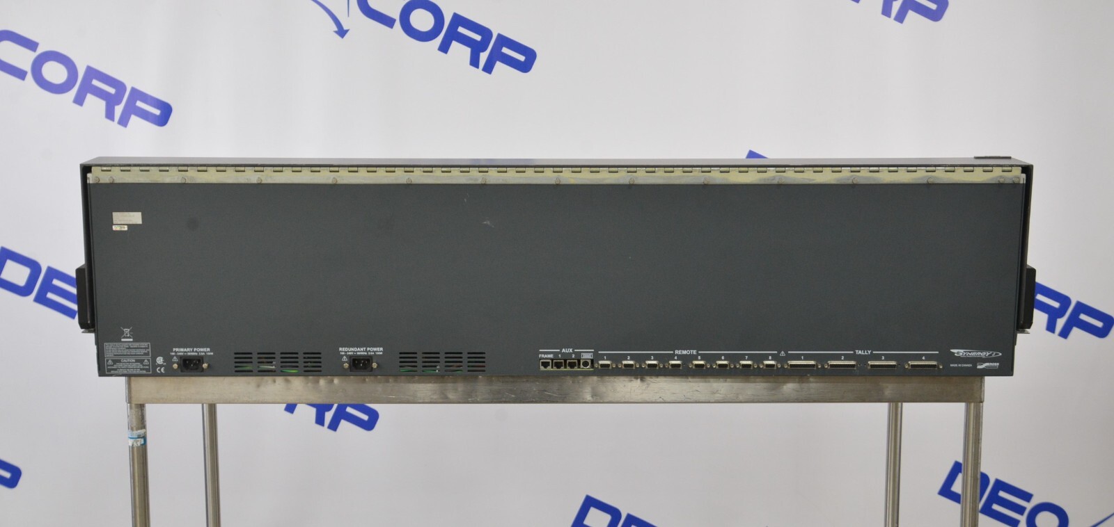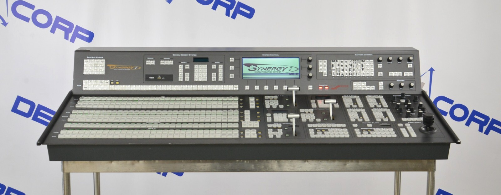 This Ross Video Synergy 3 Digital Production Switcher is in good cosmetic condition. The unit powers on; however, the power fail indicator is lit for both the panel and the frame. There are lines appearing on the screen that block some of the view and the screen does not advance past the start-up screen, for these reasons its being sold for parts. The connections are clean and in good condition. There are some scuff marks from previous use (see photos). Includes everything in the photos and nothing else.
