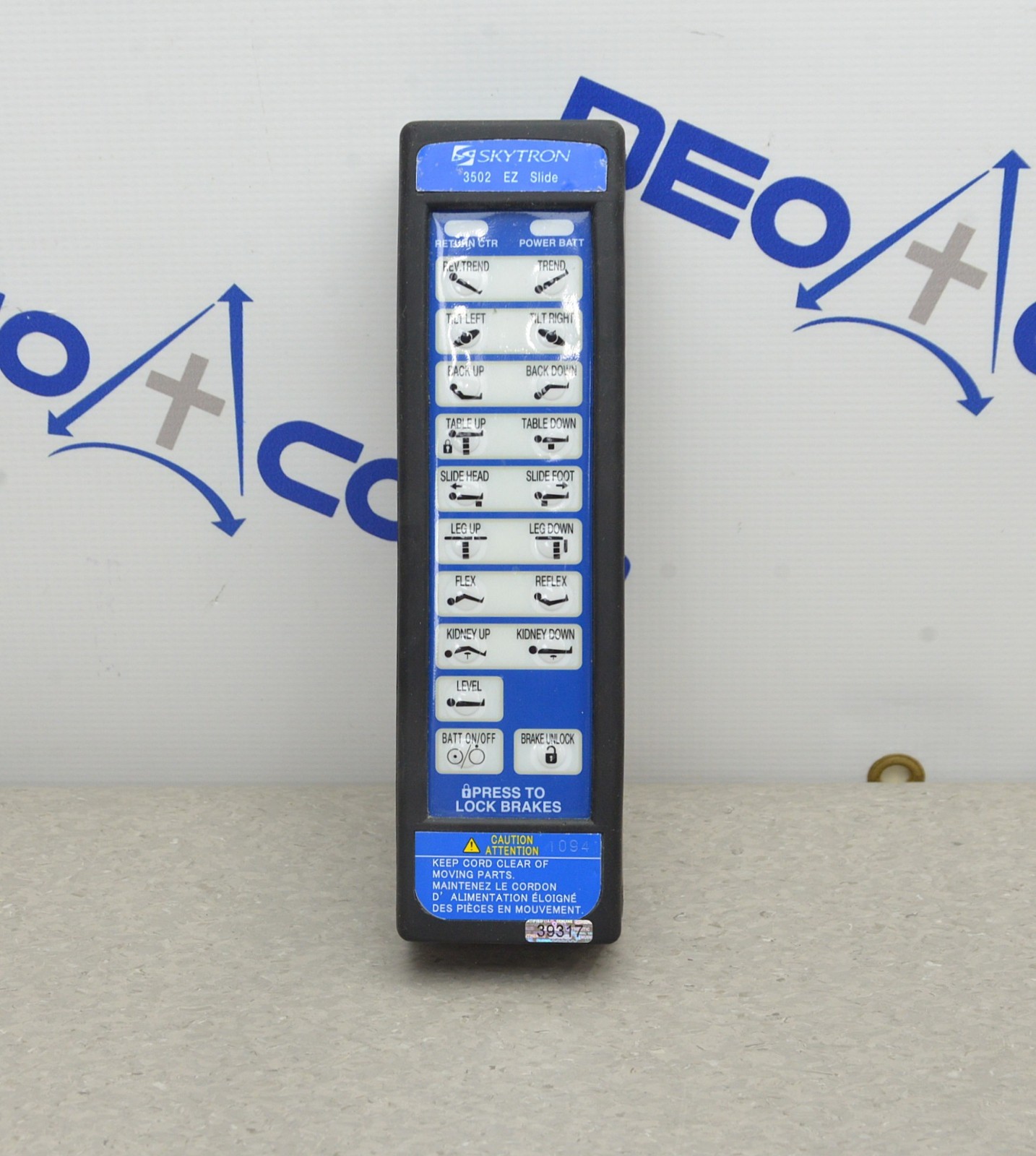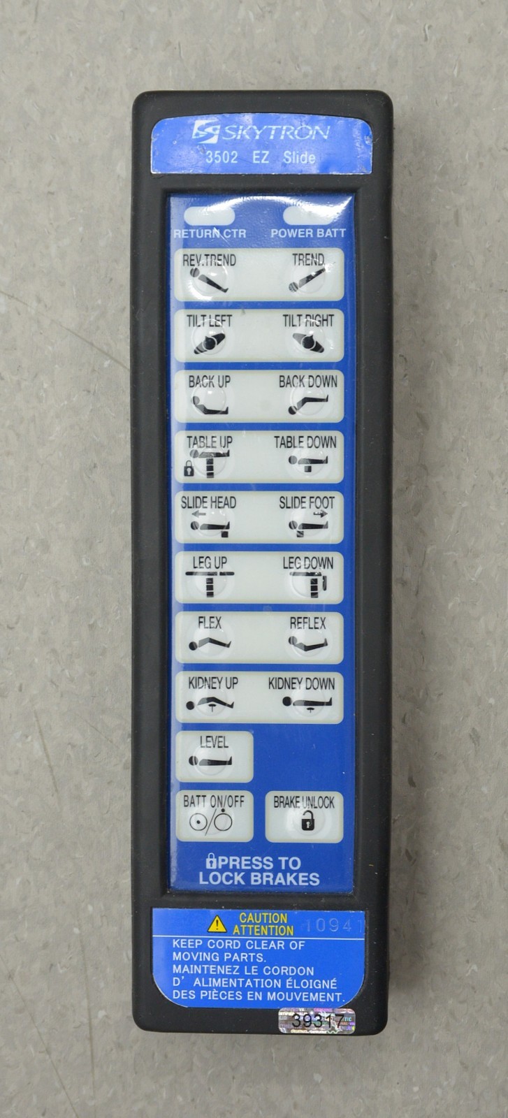 This Skytron 3502 EZ Slide Hand Control is in great working condition. This control was tested on a separate unit and each button responds properly to selection. The connection is clean and in good condition. This unit is missing the cord connector sleeve, side screws, and screw caps. There is some damage to the rubber casing from previous use (see photos). This unit comes with a 30 day money back guarantee. Includes everything in the pictures and nothing else.