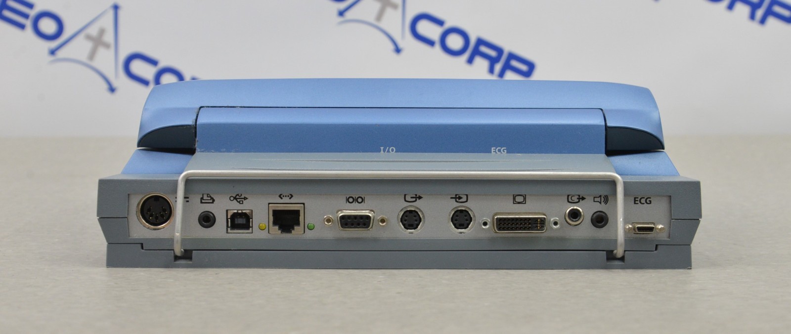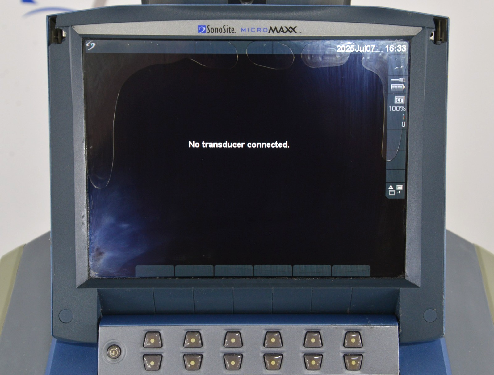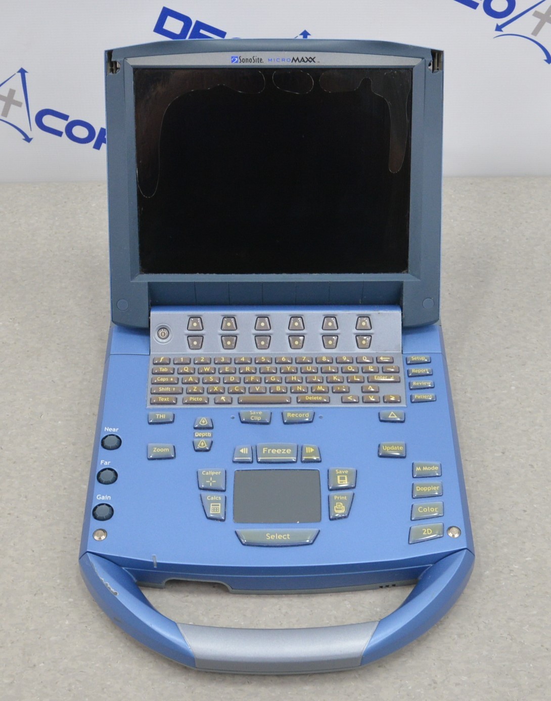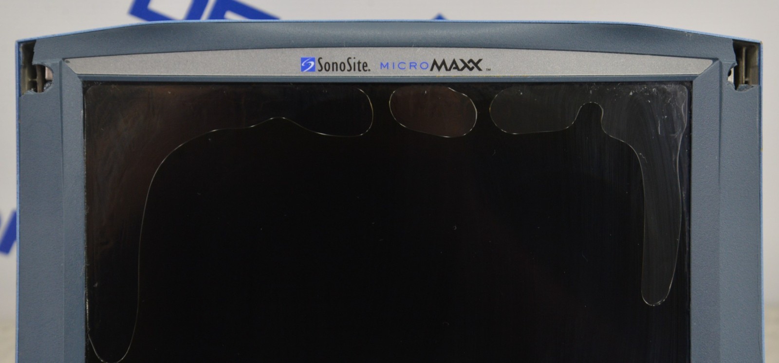This SonoSite MicroMaxx Portable System W/ Triple Connector & Rolling Cart is in fair cosmetic condition. The unit powers on; however, there is melted glue underneath the display and the top corners of the bezel are cracked, for these reasons its being sold for parts. All connection points are clean and in good condition. There are some scuff marks from previous use (see photos). Includes everything in the pictures and nothing else.