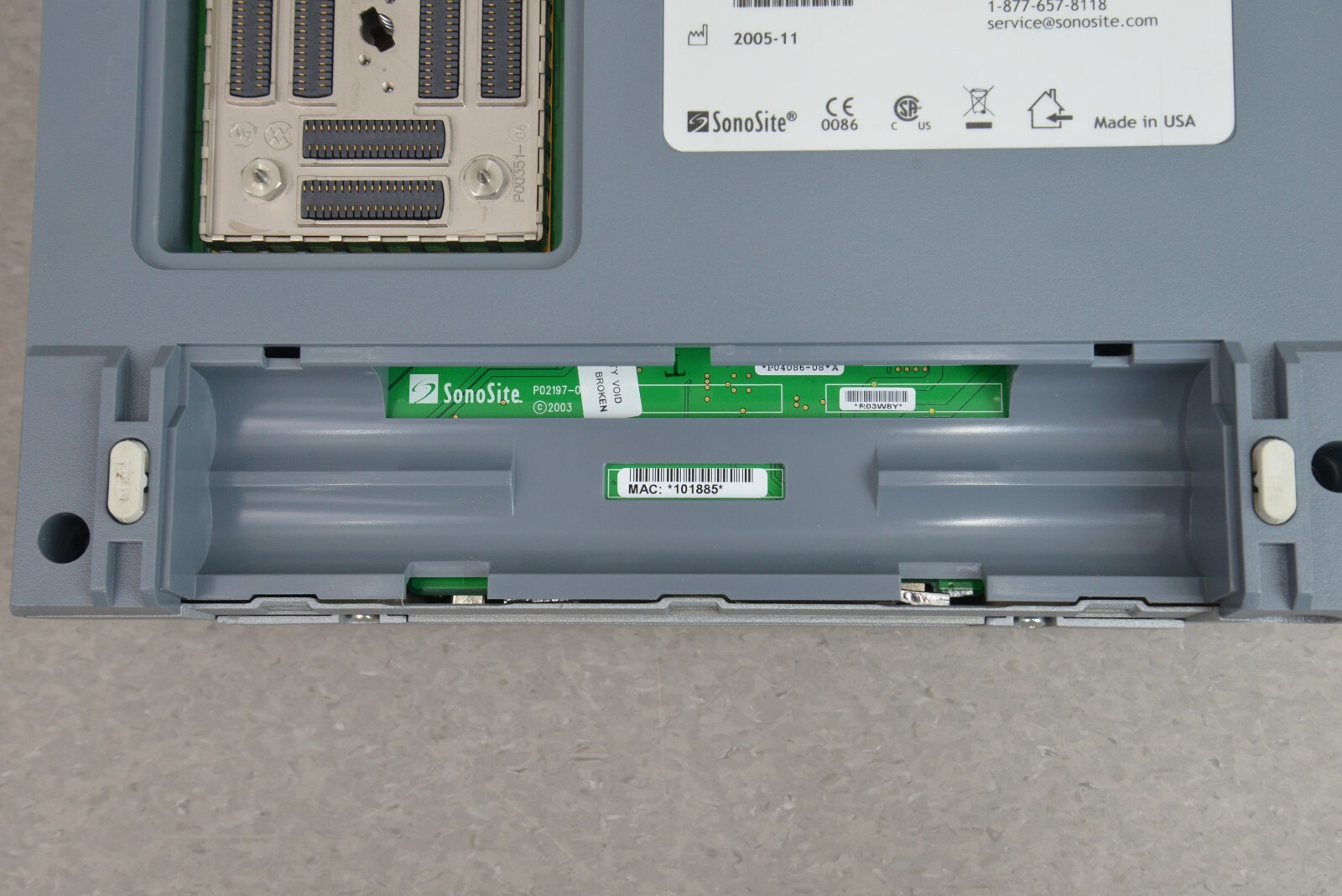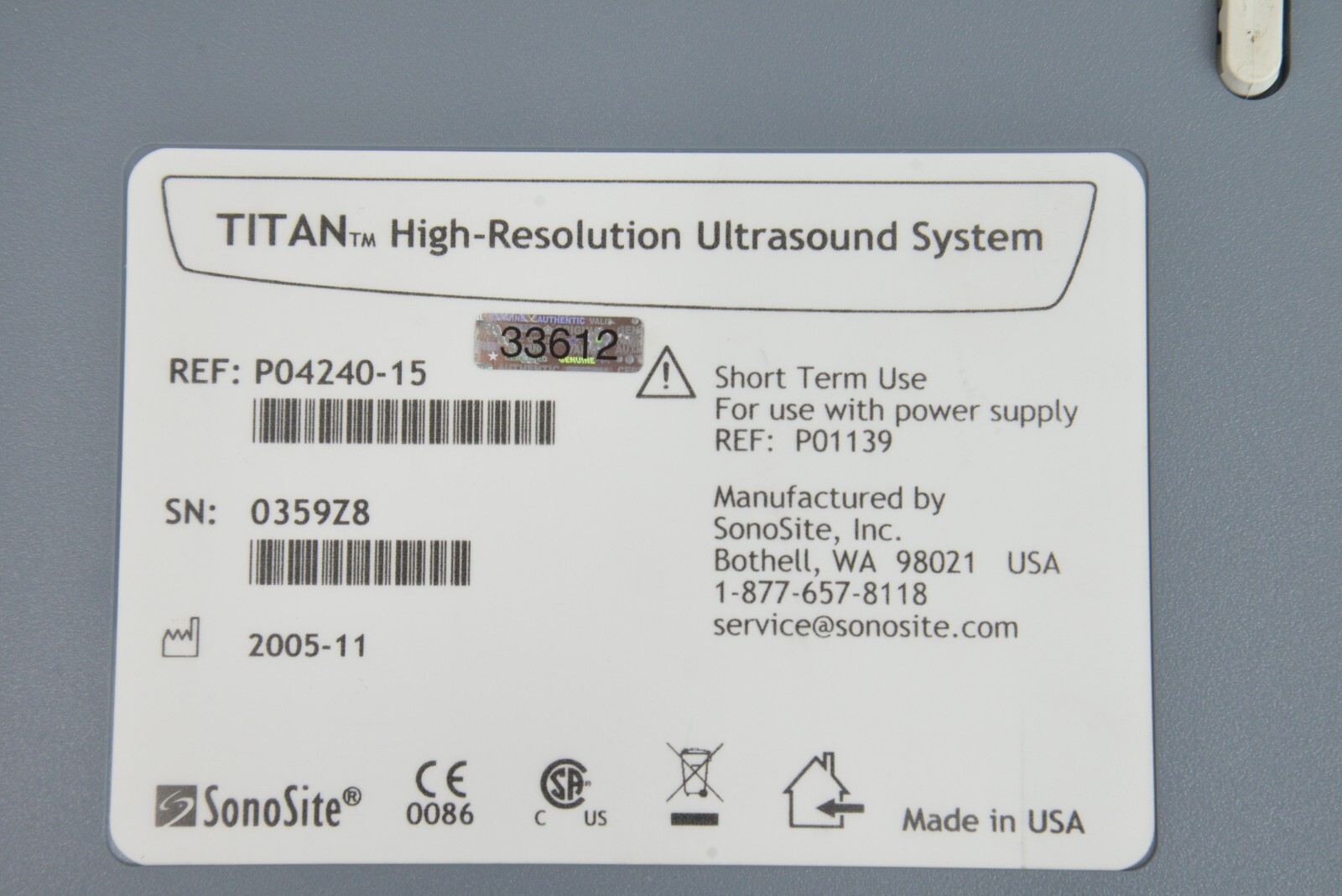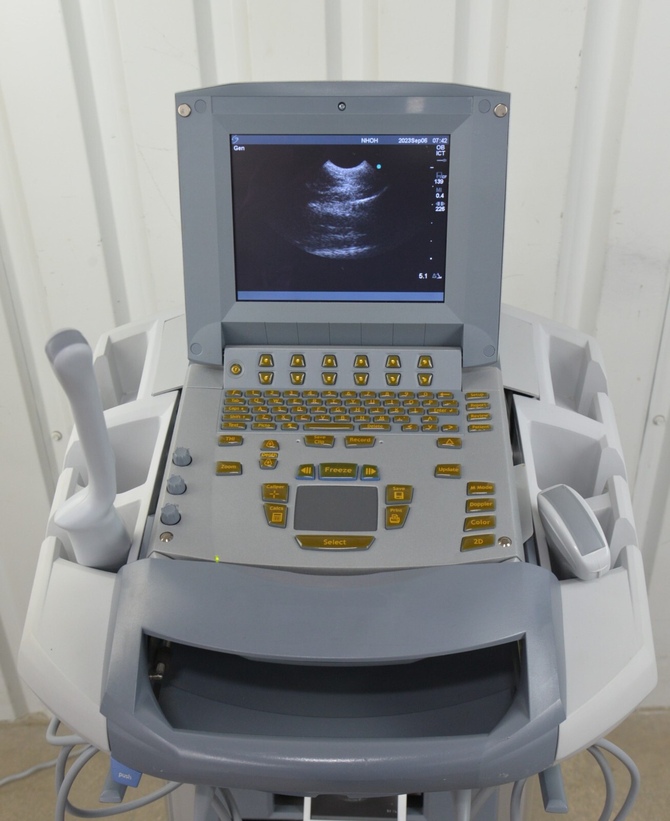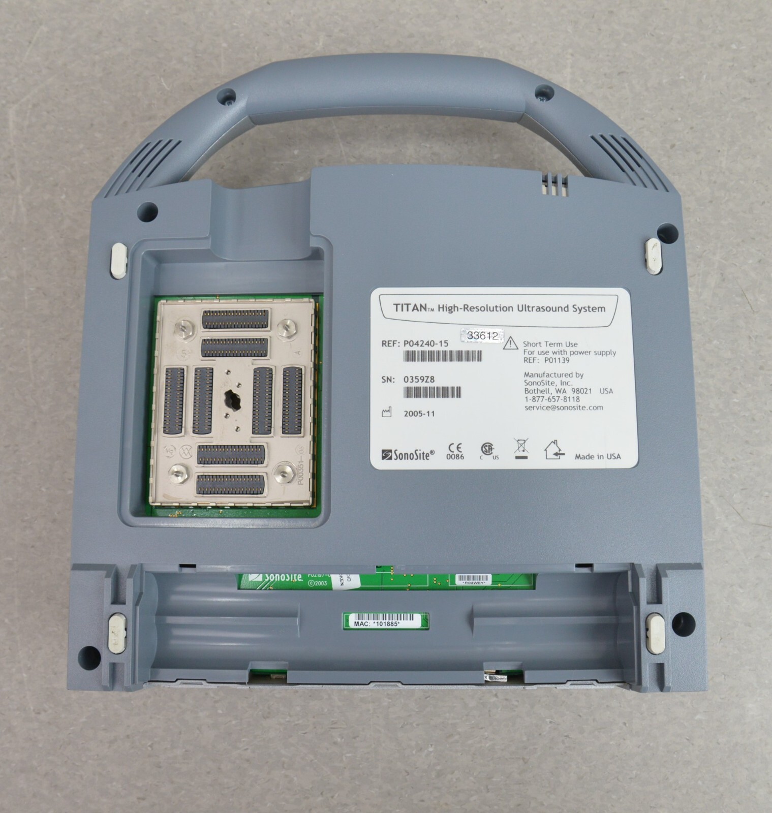 This SonoSite Titan High-Resolution Imaging System W/ SonoSite C60/5-2 MHz & ICT/8-5 is in good working condition. This unit powers on properly. The display screen has a clear picture. All buttons respond properly to selections. All connections are clean and in good condition.  There is no internal battery. The over all cosmetic condition is good with the exception of a few scuff marks from previous use (see photos). This item comes with a 30 day satisfaction guarantee. Includes everything displayed in the photos and nothing else.