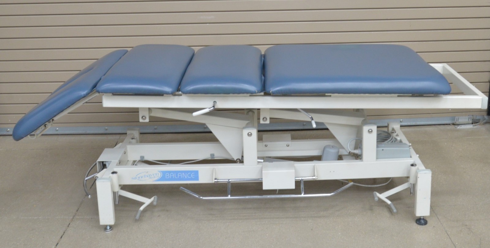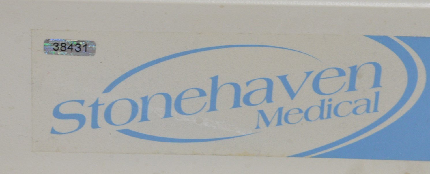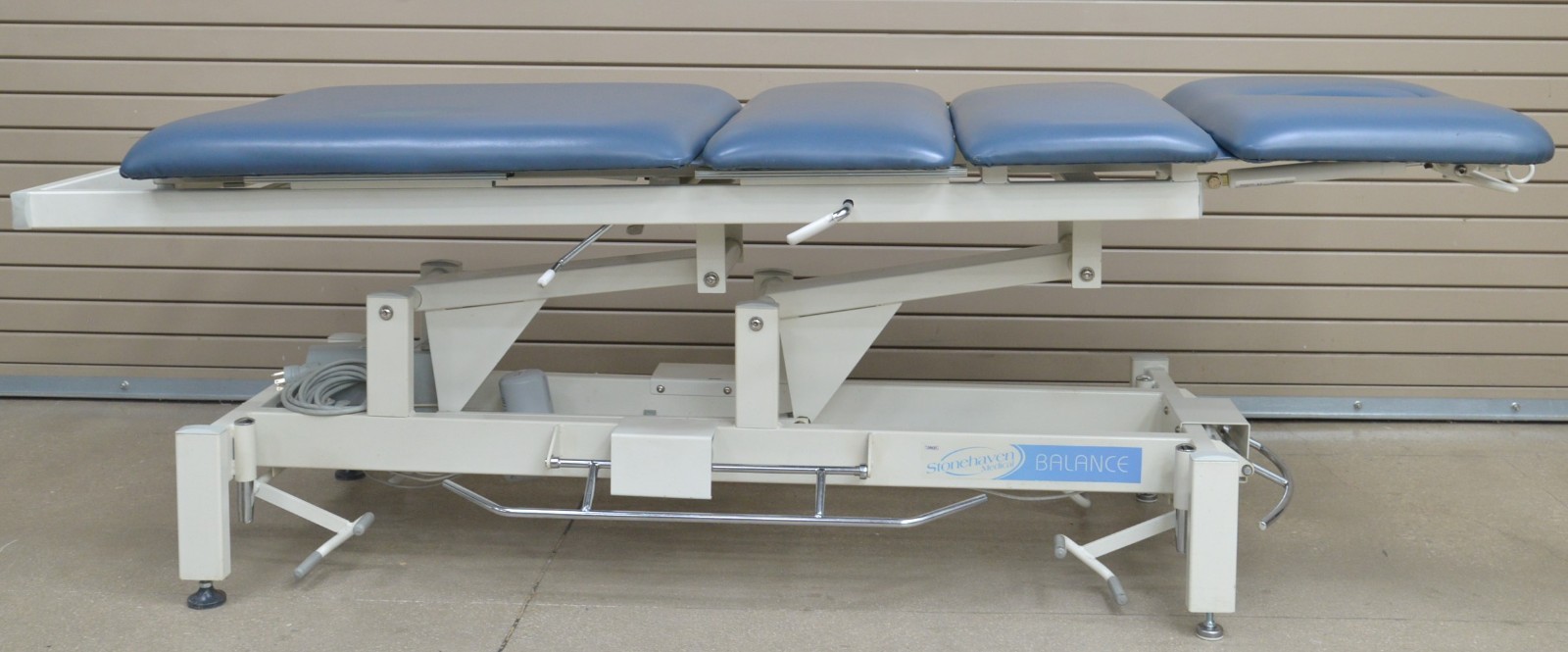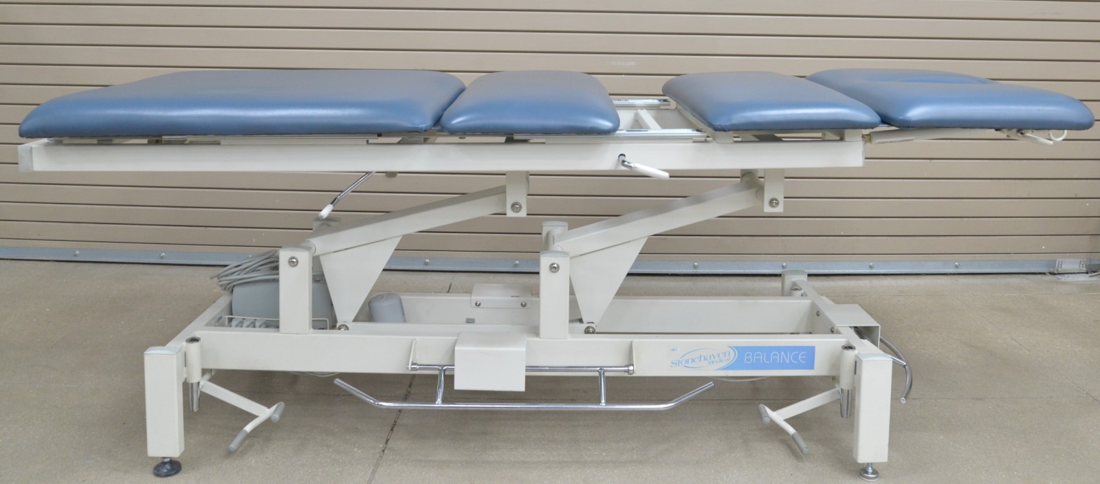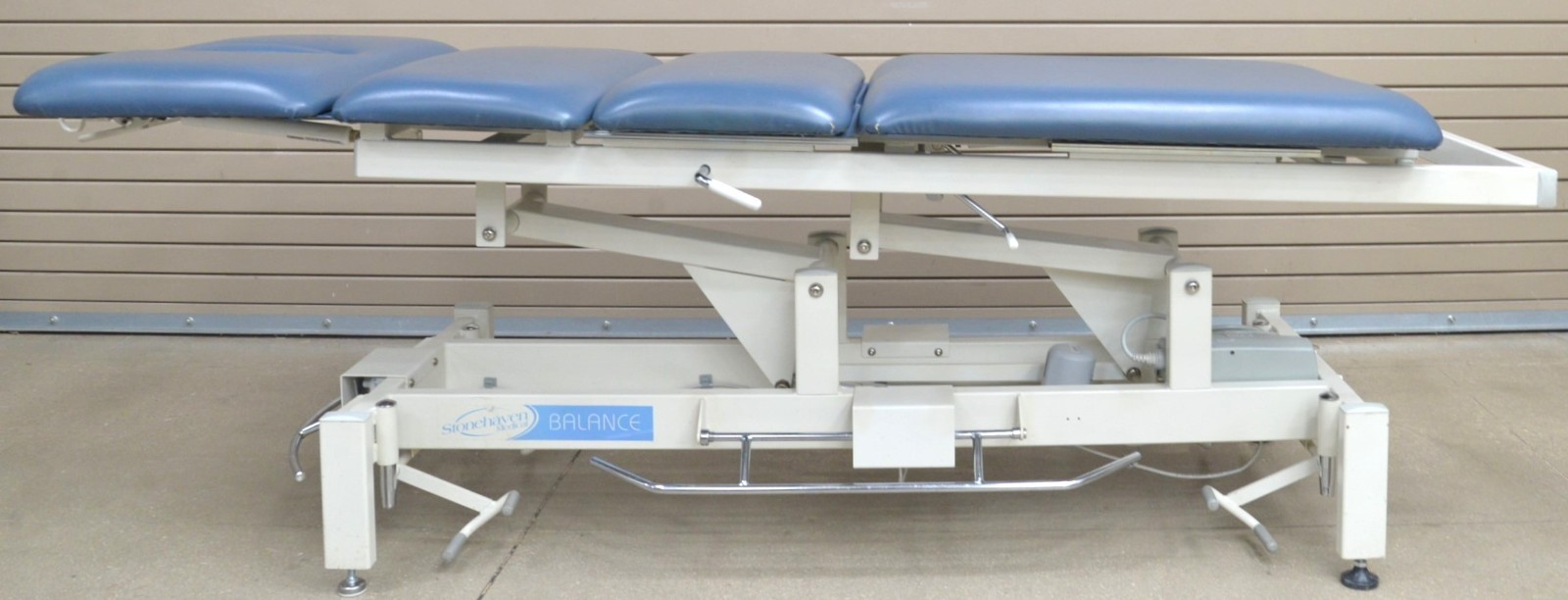 This Stonehaven Balance Traction Agility 4-Section Treatment Table Table W/ Foot Lever is in good working condition. The unit powers on and moves properly through all range of motion. The foot leavers respond properly to selections. There are some scuff marks, slight discoloration, and the upholstery has been repaired on both sides of the unit (see photos). The back left wheel mount was damaged, and it does not have wheels. Does not include traction arm. This unit comes with a 30 day satisfaction guarantee. Includes everything in the pictures and nothing else.