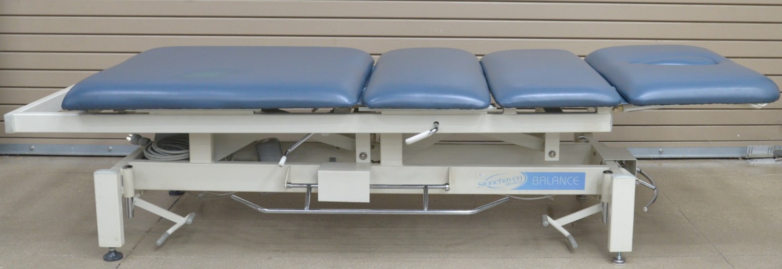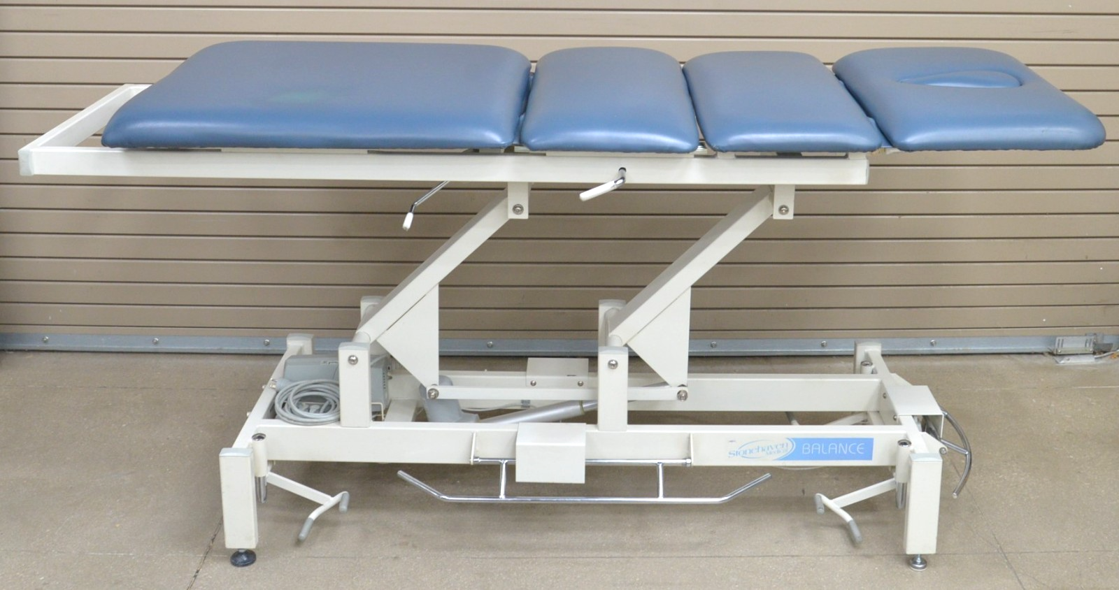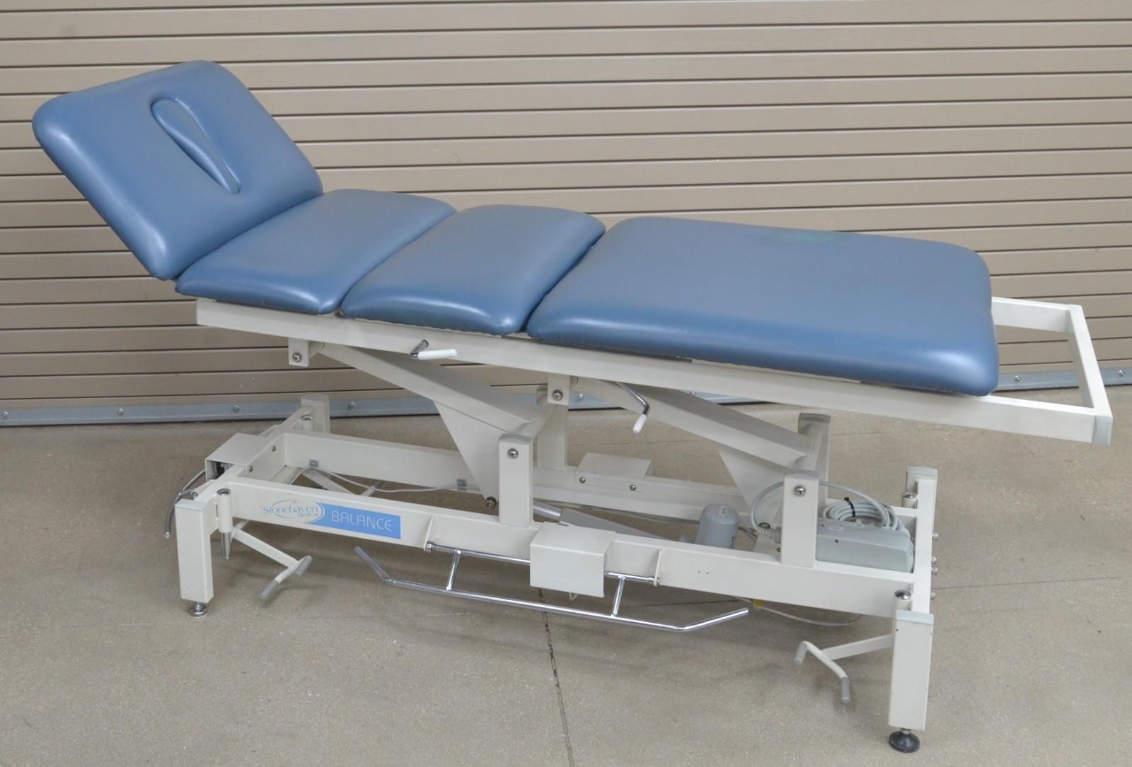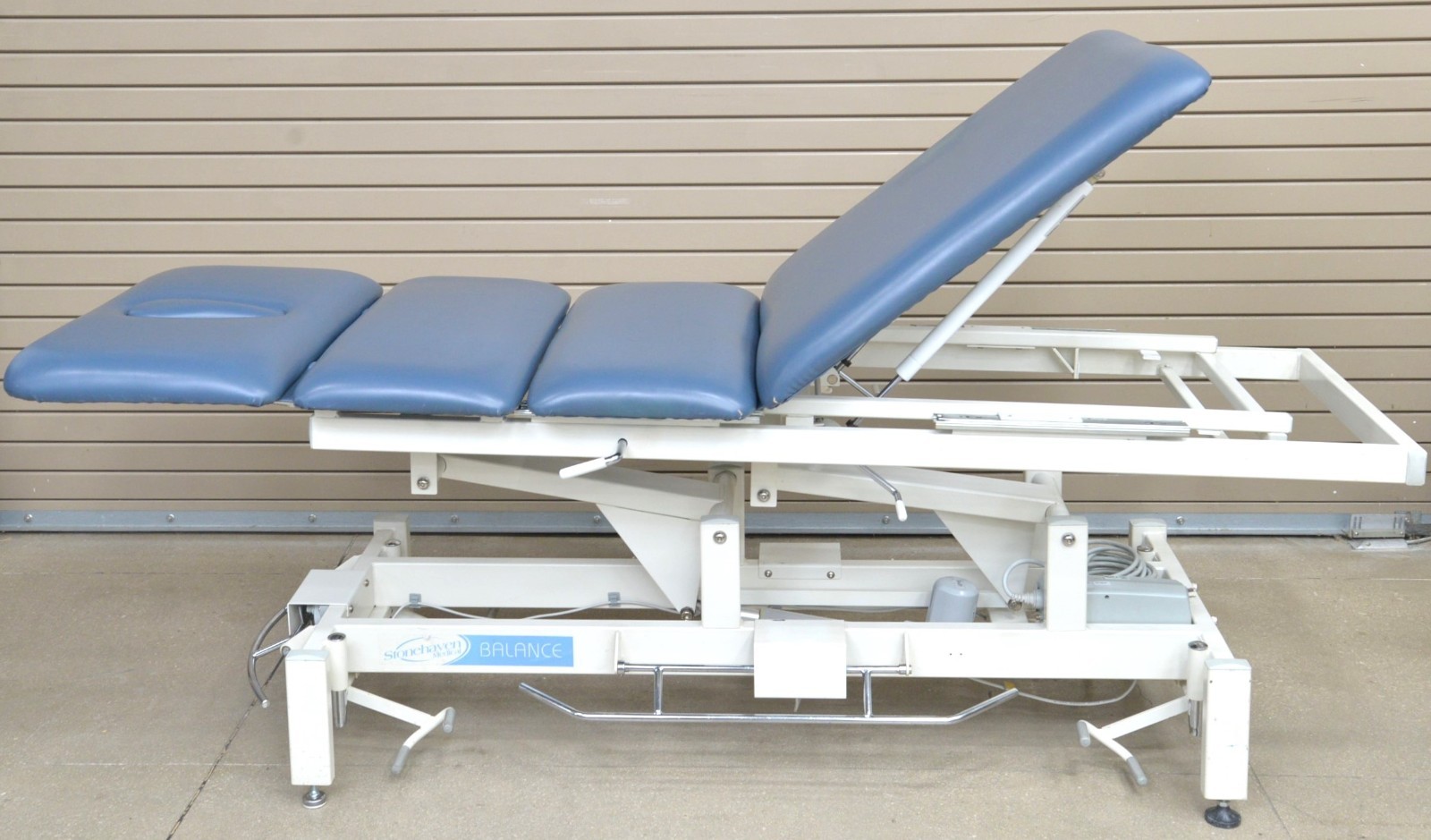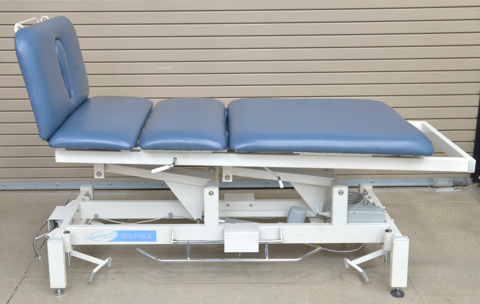 This Stonehaven Balance Traction Agility 4-Section Treatment Table Table W/ Foot Lever is in good working condition. The unit powers on and moves properly through all range of motion. The foot leavers respond properly to selections. There are some scuff marks, slight discoloration, and the upholstery has been repaired on both sides of the unit (see photos). The back left wheel mount was damaged, and it does not have wheels. Does not include traction arm. This unit comes with a 30 day satisfaction guarantee. Includes everything in the pictures and nothing else.