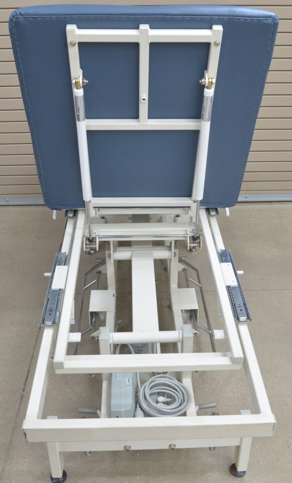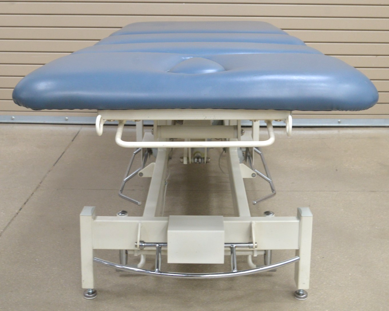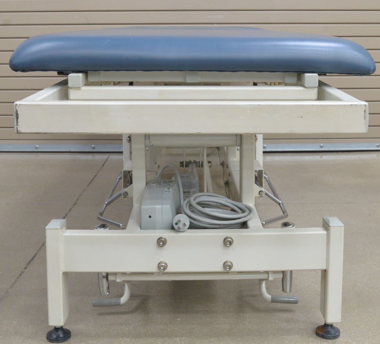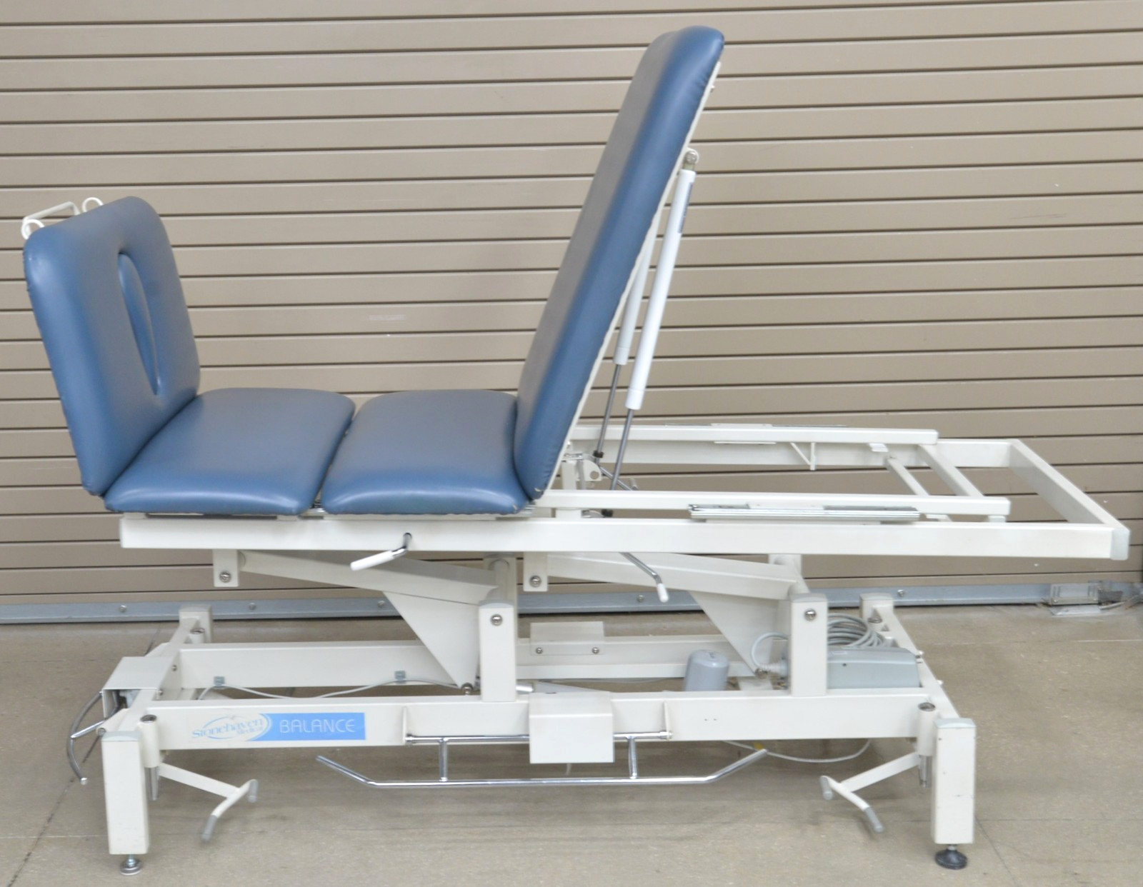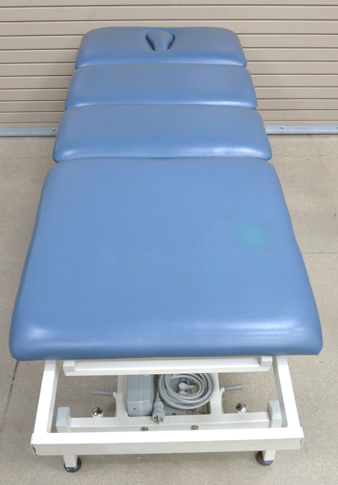 This Stonehaven Balance Traction Agility 4-Section Treatment Table Table W/ Foot Lever is in good working condition. The unit powers on and moves properly through all range of motion. The foot leavers respond properly to selections. There are some scuff marks, slight discoloration, and the upholstery has been repaired on both sides of the unit (see photos). The back left wheel mount was damaged, and it does not have wheels. Does not include traction arm. This unit comes with a 30 day satisfaction guarantee. Includes everything in the pictures and nothing else.
