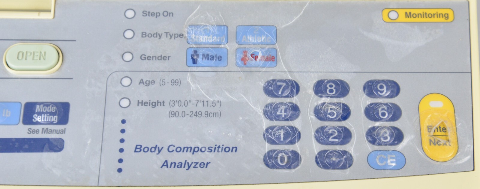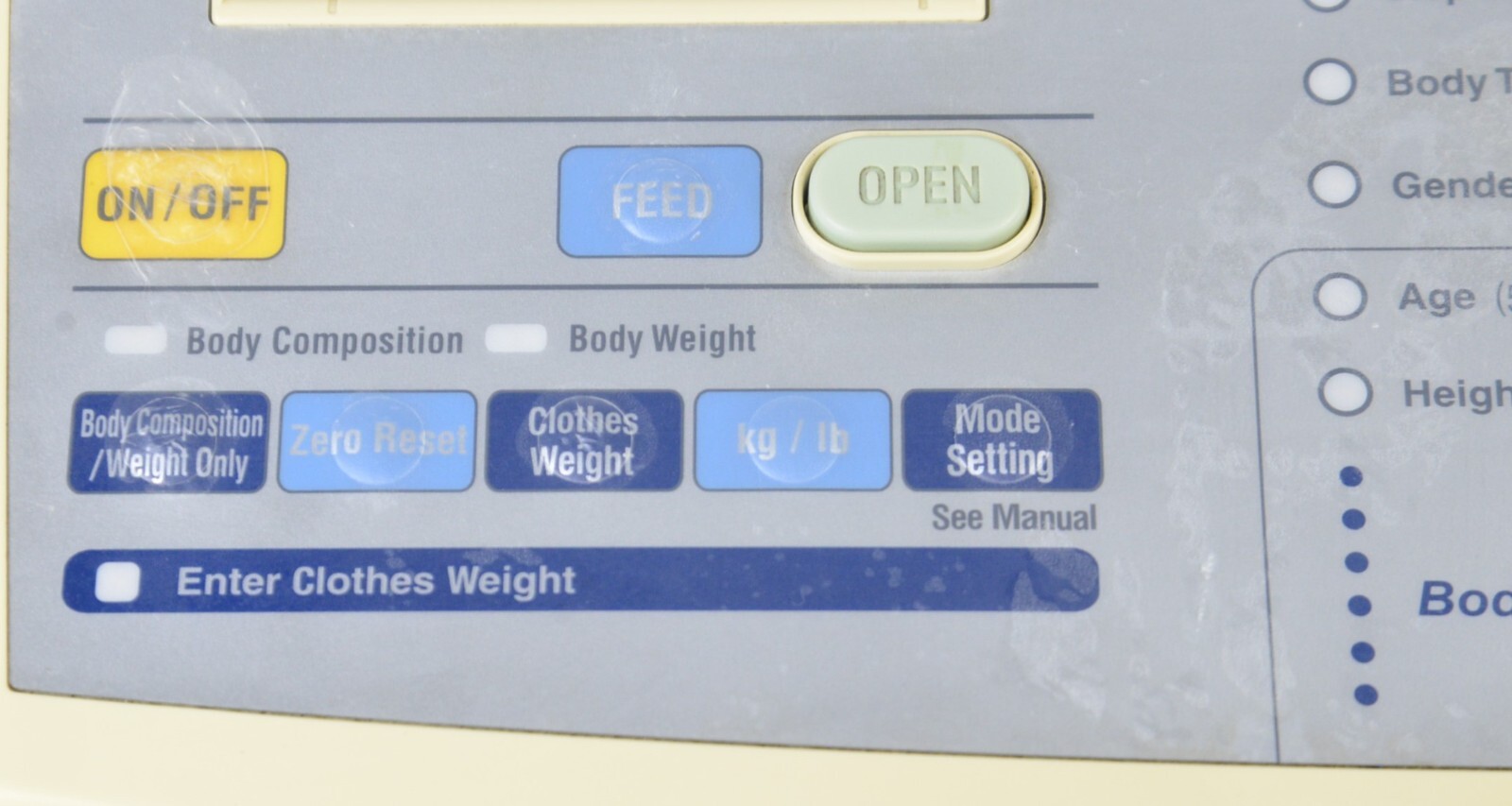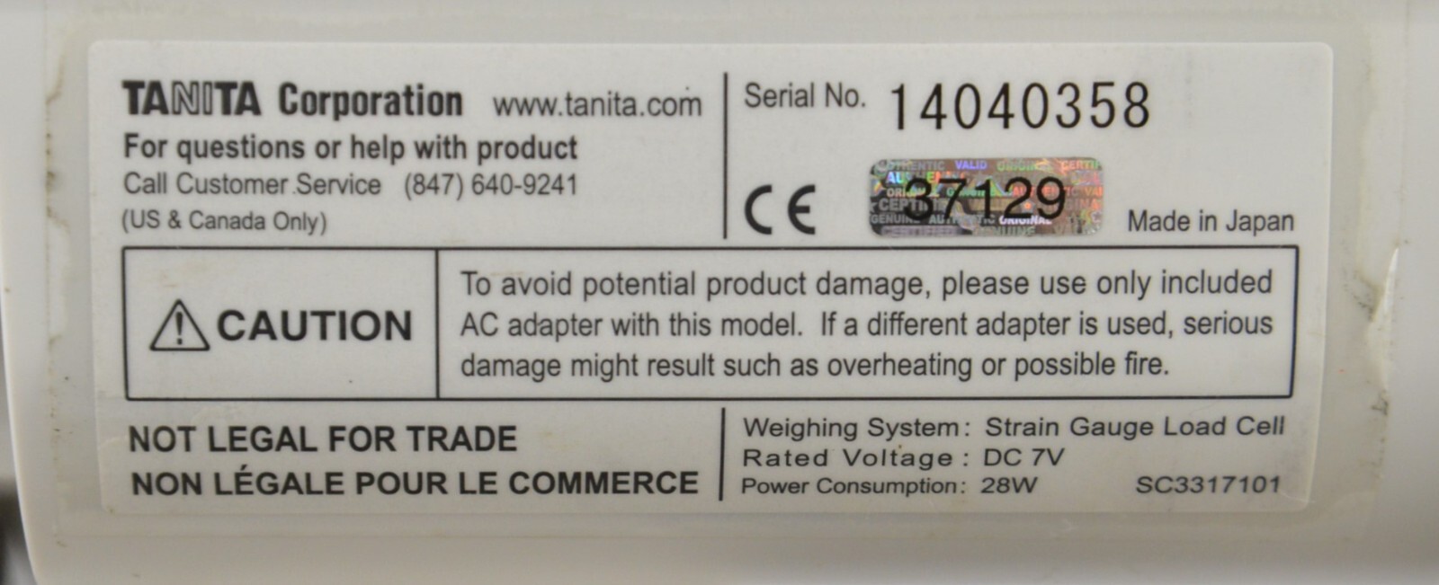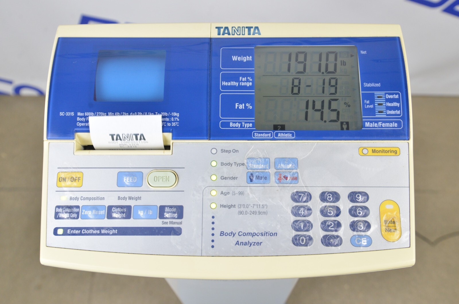 This Tanita SC-331S Body Composition Analyzer is in good working condition. The unit powers on and responds to all selections. The unit accurately weighs and calculates body composition. The printer works properly. There are some scuff marks from previous use and the protective cover on the face of the unit is peeling (see photos). This unit comes with a 30 day satisfaction guarantee. Includes everything in the pictures and nothing else.
