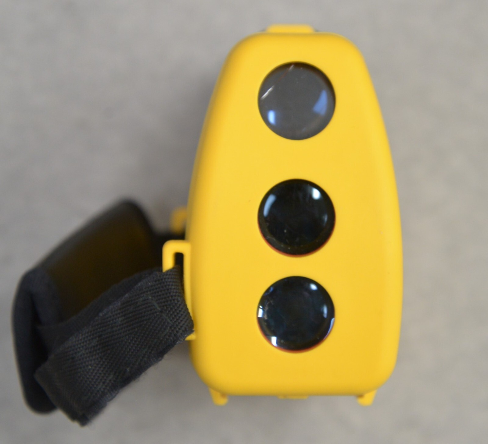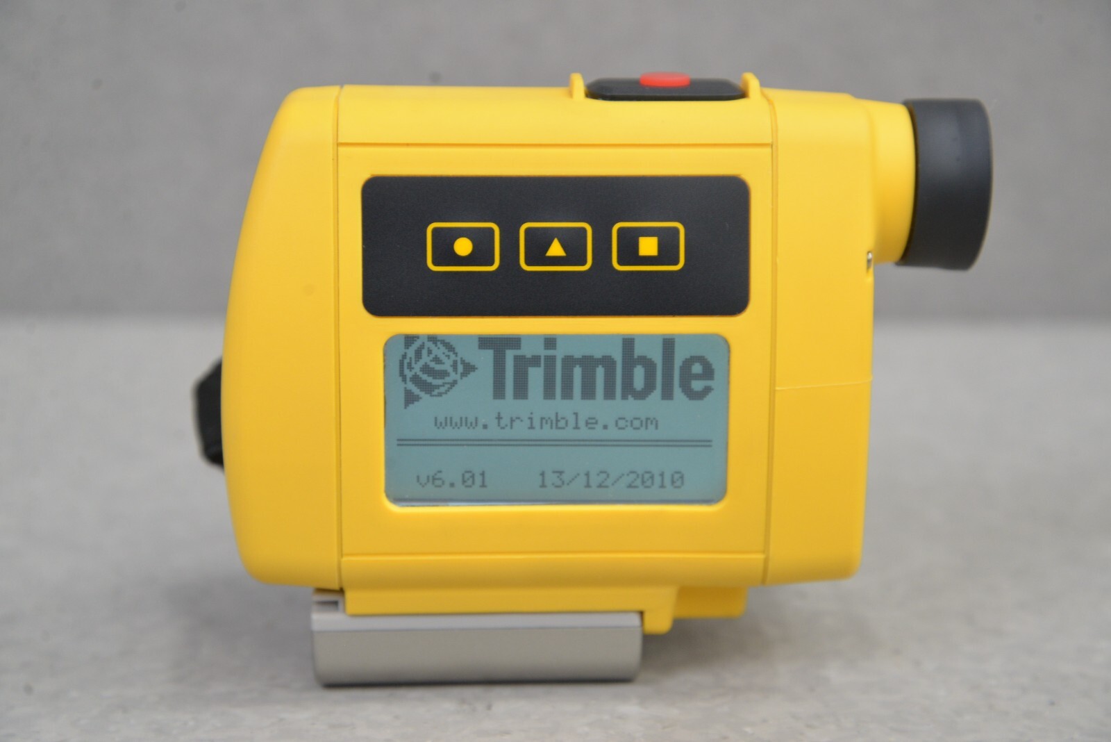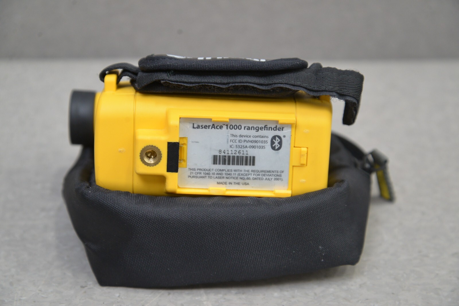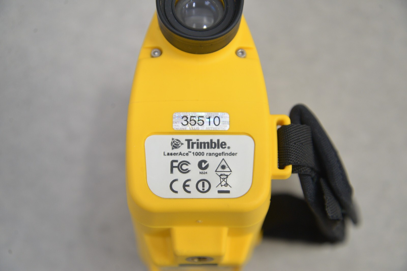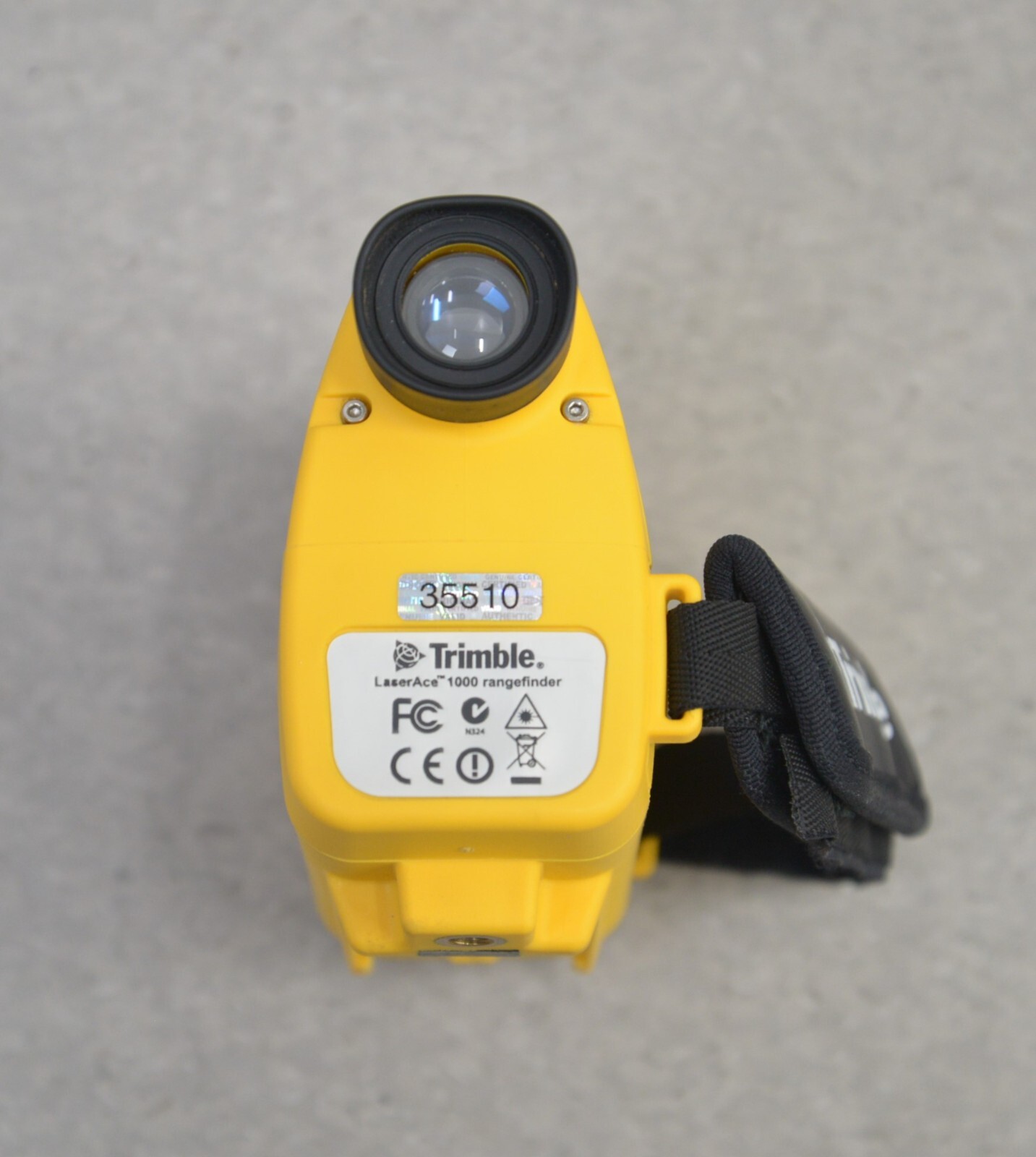 The Trimble LaserAce 1000 Rangefinder is in good condition. All the buttons are in good condition and respond when activated. This unit powers on. This unit includes a battery charger & two batteries. There is a minor crack on the viewing lens and screen of this unit but does not interfere with proper functioning (see photos).