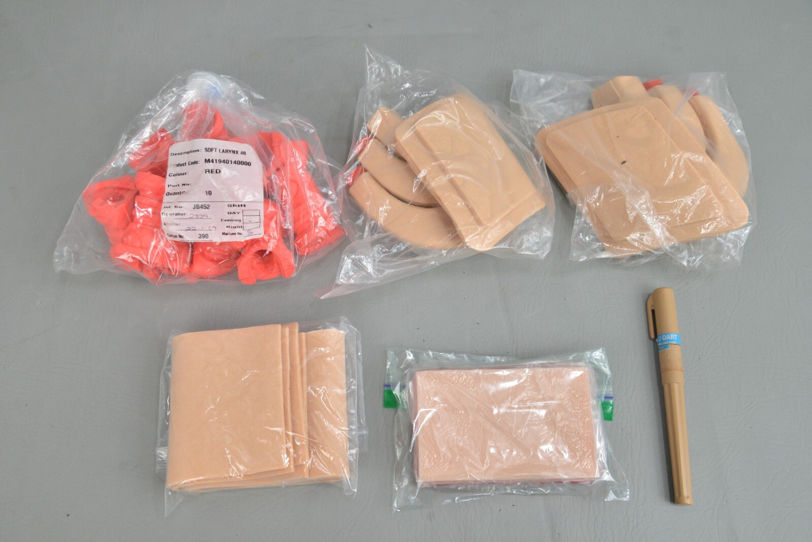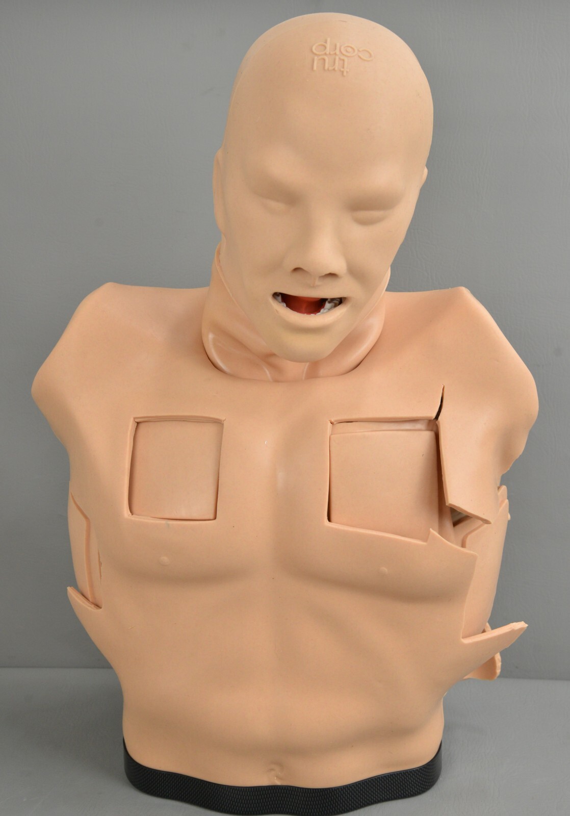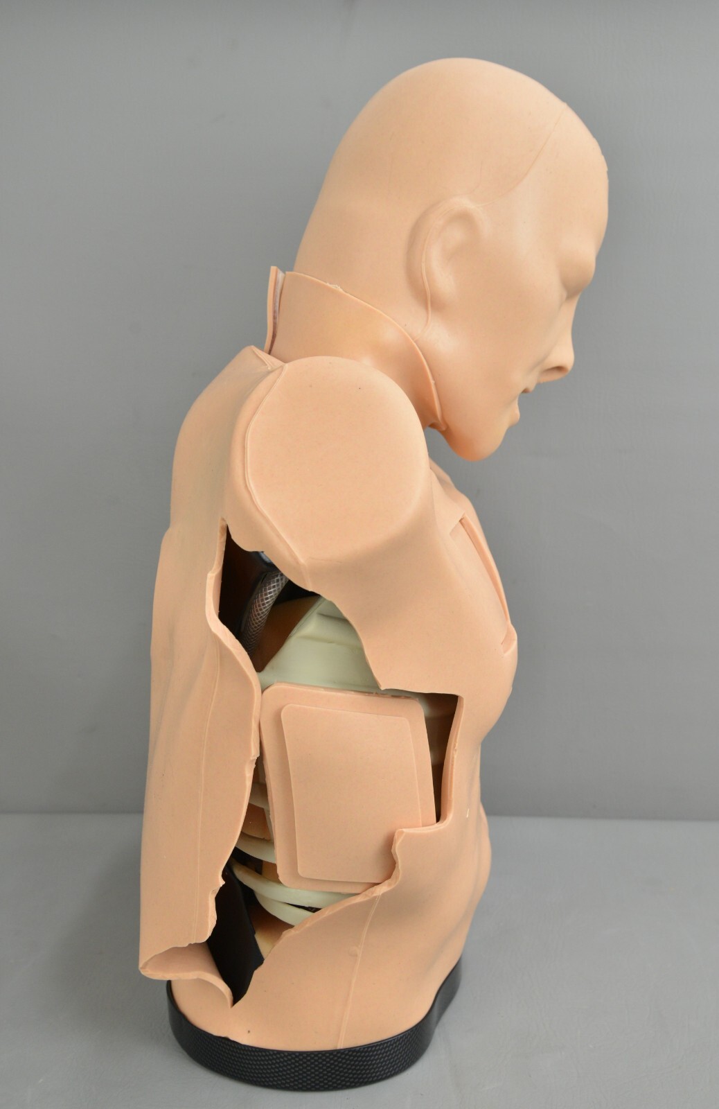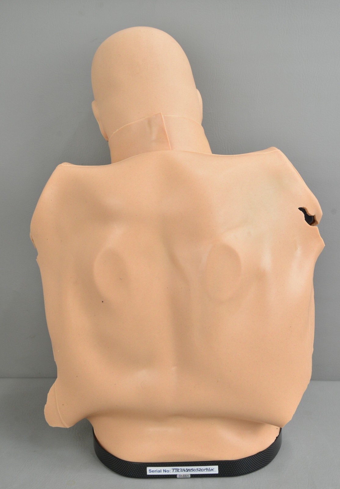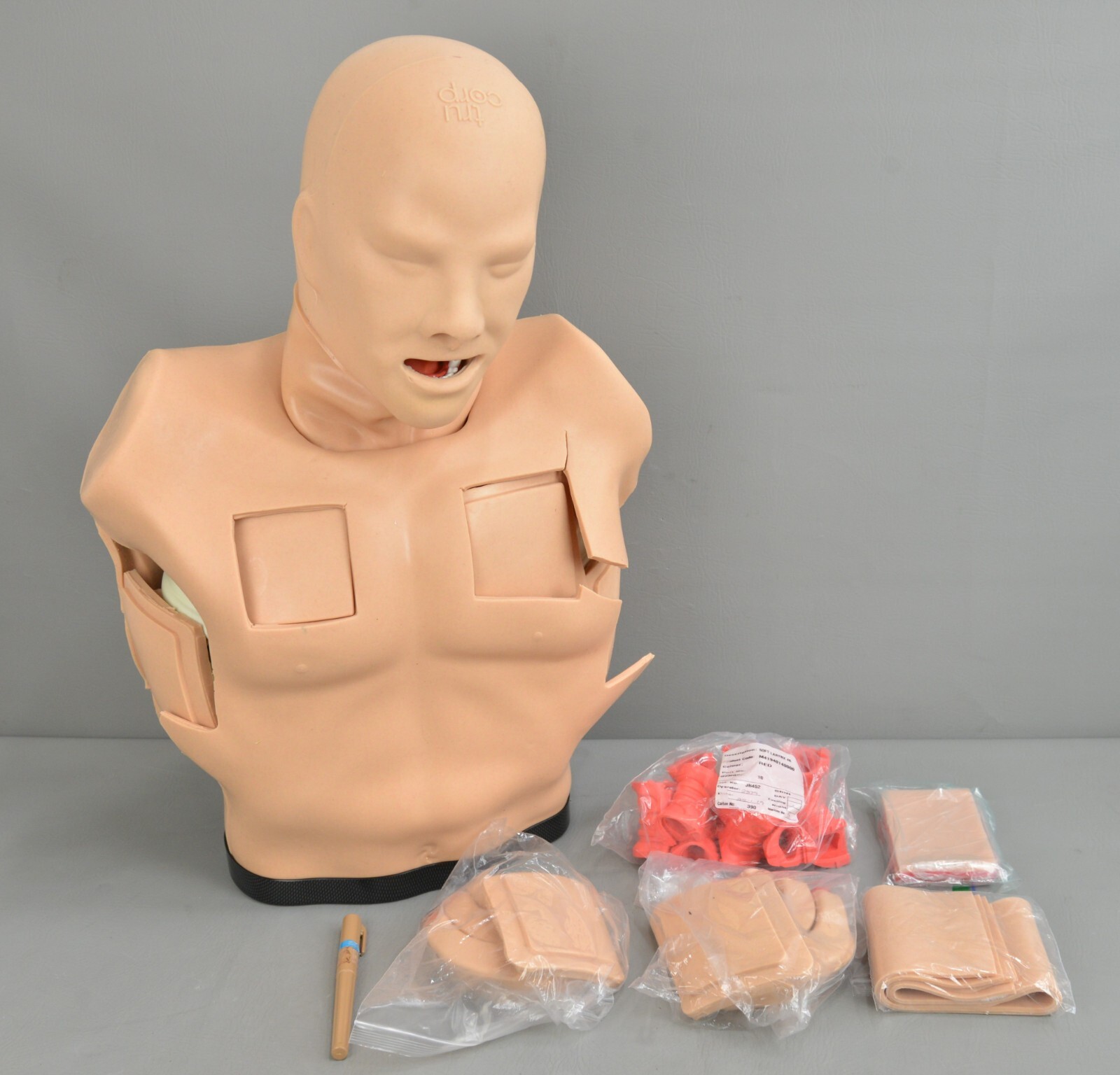 This training manikin came from a working facility and is in good condition. There are some tears along the side of the manikin skin and will need replacing (see photo). Includes (2) Wrap Around Neck Skin, (1) Pair of Right & Left Chest Drain Inserts, (10) Soft Larynx 40 and a carrier bag. This item comes with a 30 day satisfaction guarantee. Comes with everything displayed in the photos and nothing else