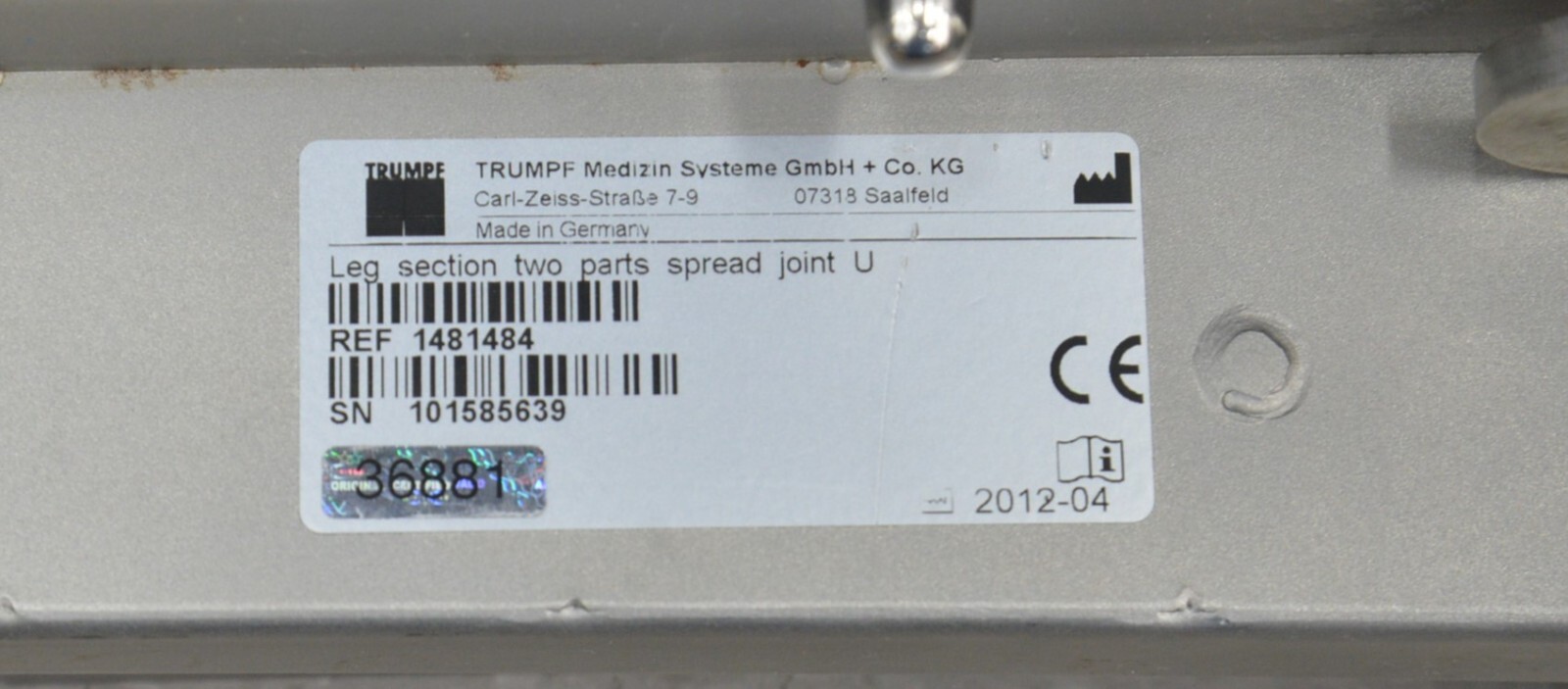 This Trumpf Two Part Spread Right Leg Section 1481484 W/ Foam Pad Part# 111064-A is in good condition. The velcro on the foam pad does not hold tightly to the platform. The platform also has minor scuff marks from previous use (see photos). This unit comes with a 30 day satisfaction guarantee. Includes everything in the pictures and nothing else.