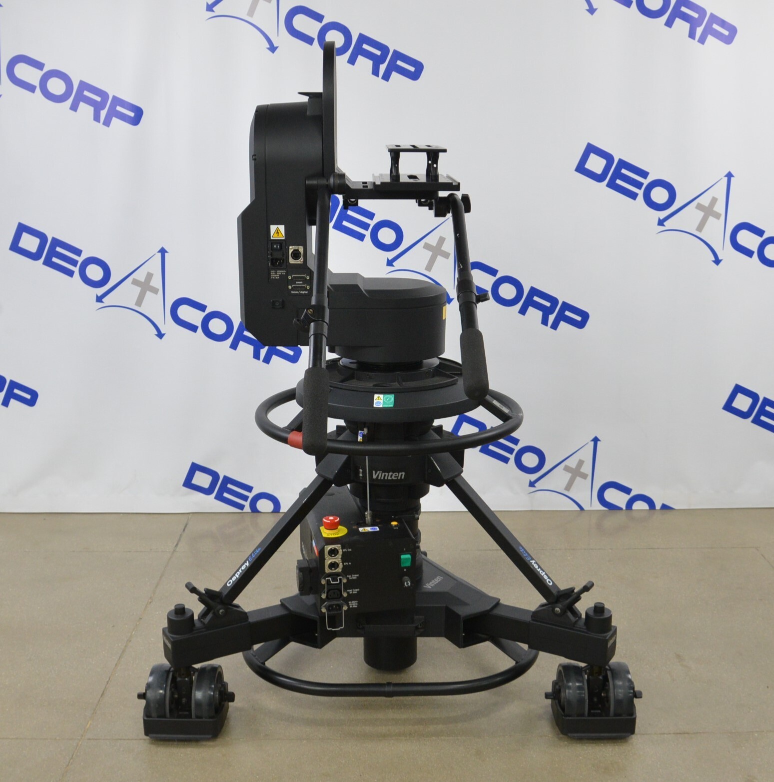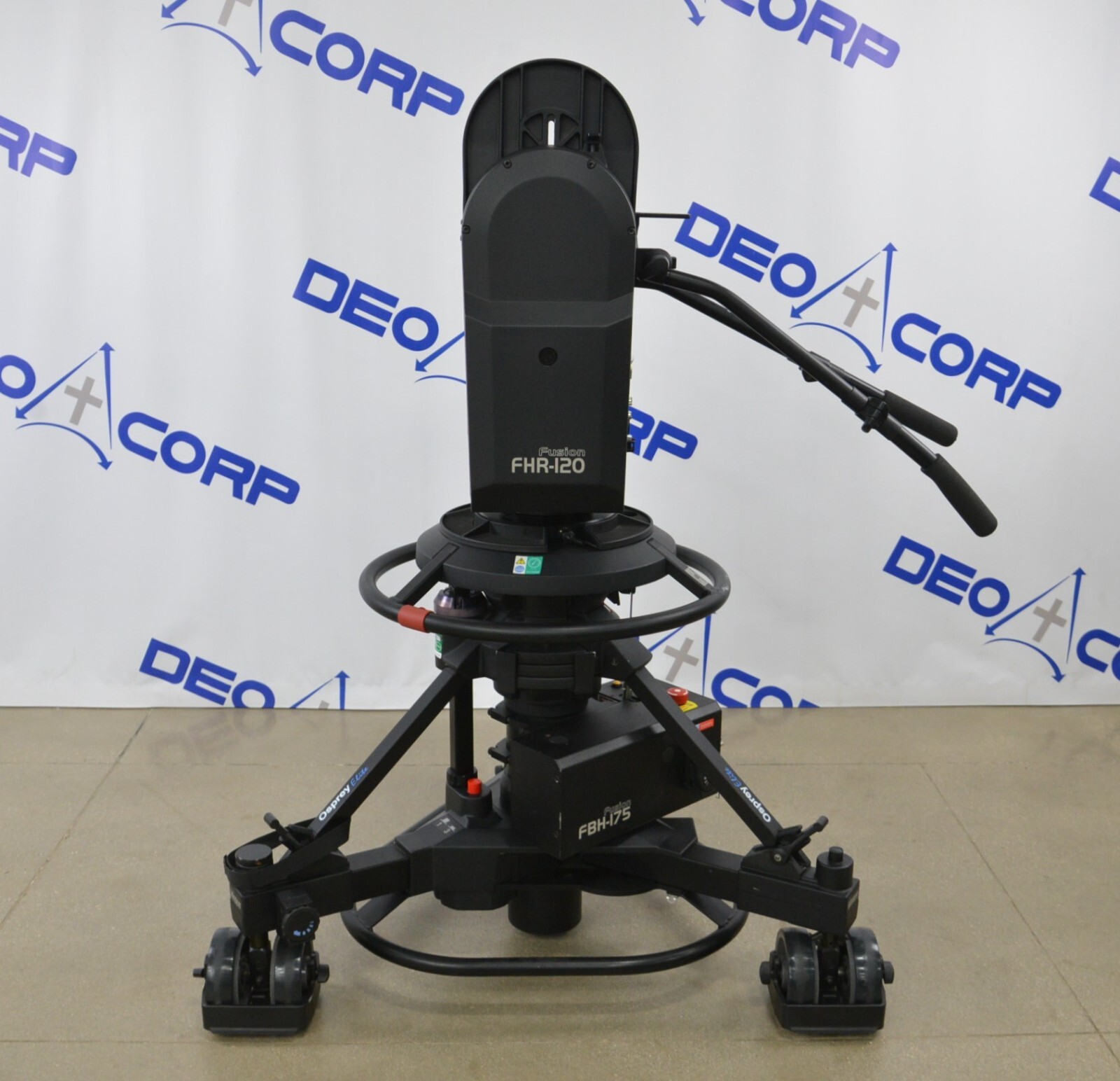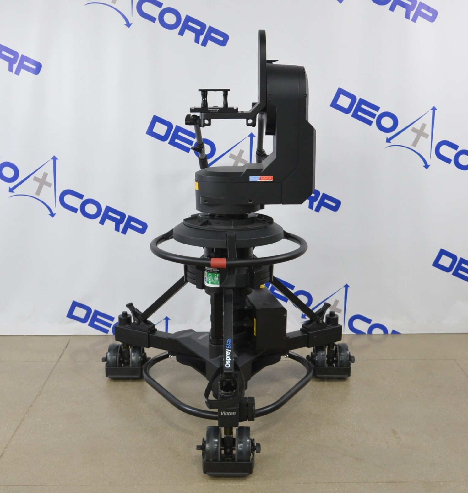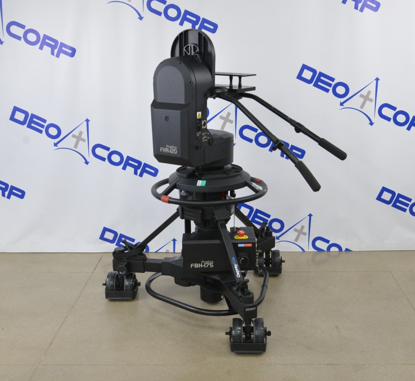 This Vinten Osprey Elite Pedestal Fusion FBH-175 W/ Fusion FHR-120 Robotic Pan Head is in great working condition. The unit powers on and all adjustments function properly. The unit rolls smoothly and the wheels lock properly. All connection ports are clean and in good condition.  The Elite pedestal allows smooth vertical movements due to its two-stage pneumatic central column and unique horizontal “crab” movements. The pedestal has a load capacity of 165 LBS and a max height of 56 inches. There are some scuff marks from previous use (see photos). This unit comes with a 30 day satisfaction guarantee. Includes everything in the pictures and nothing else.