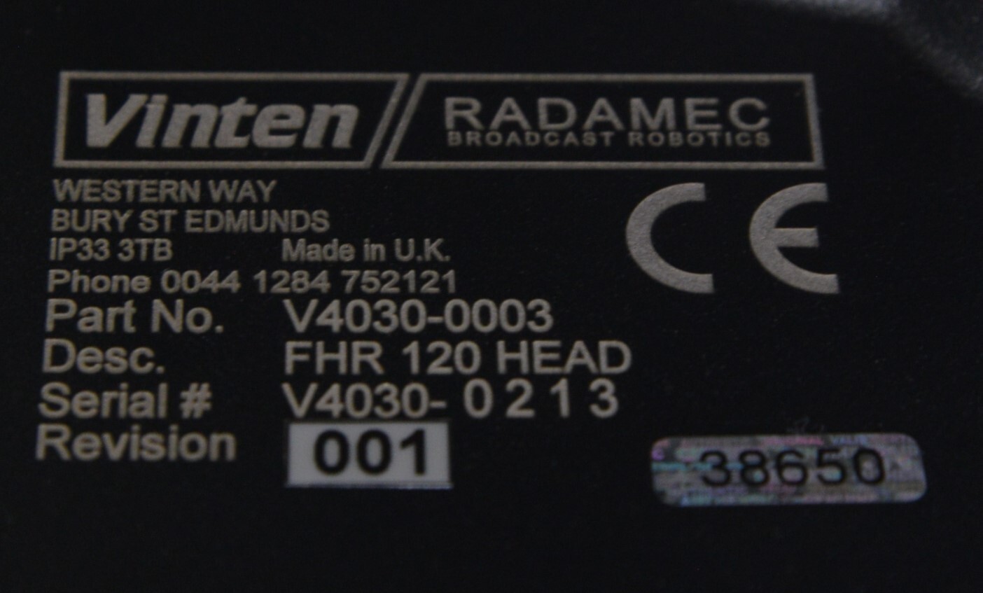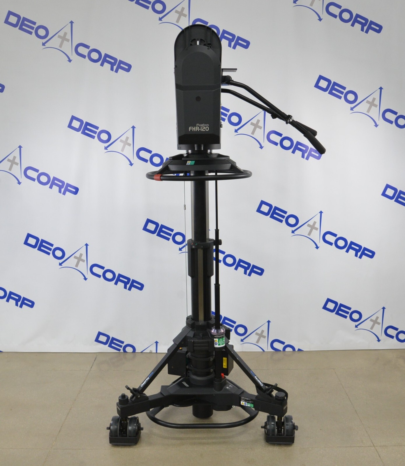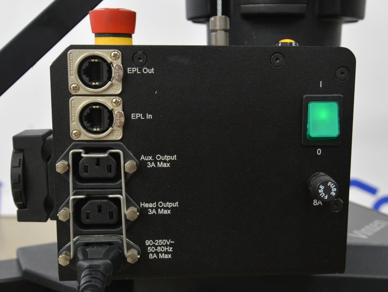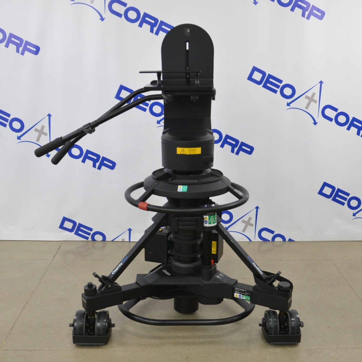 This Vinten Osprey Elite Pedestal Fusion FBH-175 W/ Fusion FHR-120 Robotic Pan Head is in great working condition. The unit powers on and all adjustments function properly. The unit rolls smoothly and the wheels lock properly. All connection ports are clean and in good condition.  The Elite pedestal allows smooth vertical movements due to its two-stage pneumatic central column and unique horizontal “crab” movements. The pedestal has a load capacity of 165 LBS and a max height of 56 inches. There are some scuff marks from previous use (see photos). This unit comes with a 30 day satisfaction guarantee. Includes everything in the pictures and nothing else.