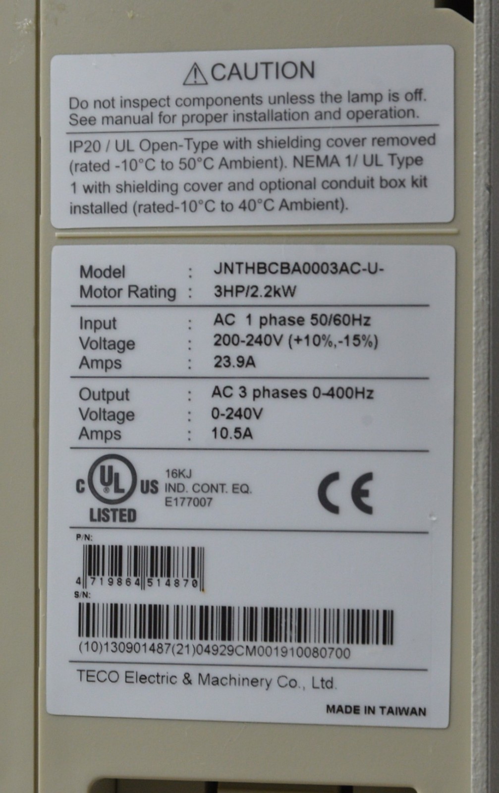 (1) TECO Speecon 7300CV series Variable Frequency Drive JNTHBCBA0003AC-U-