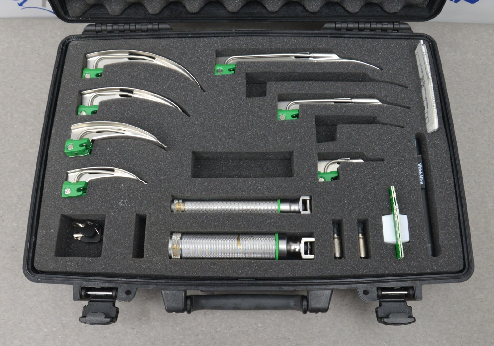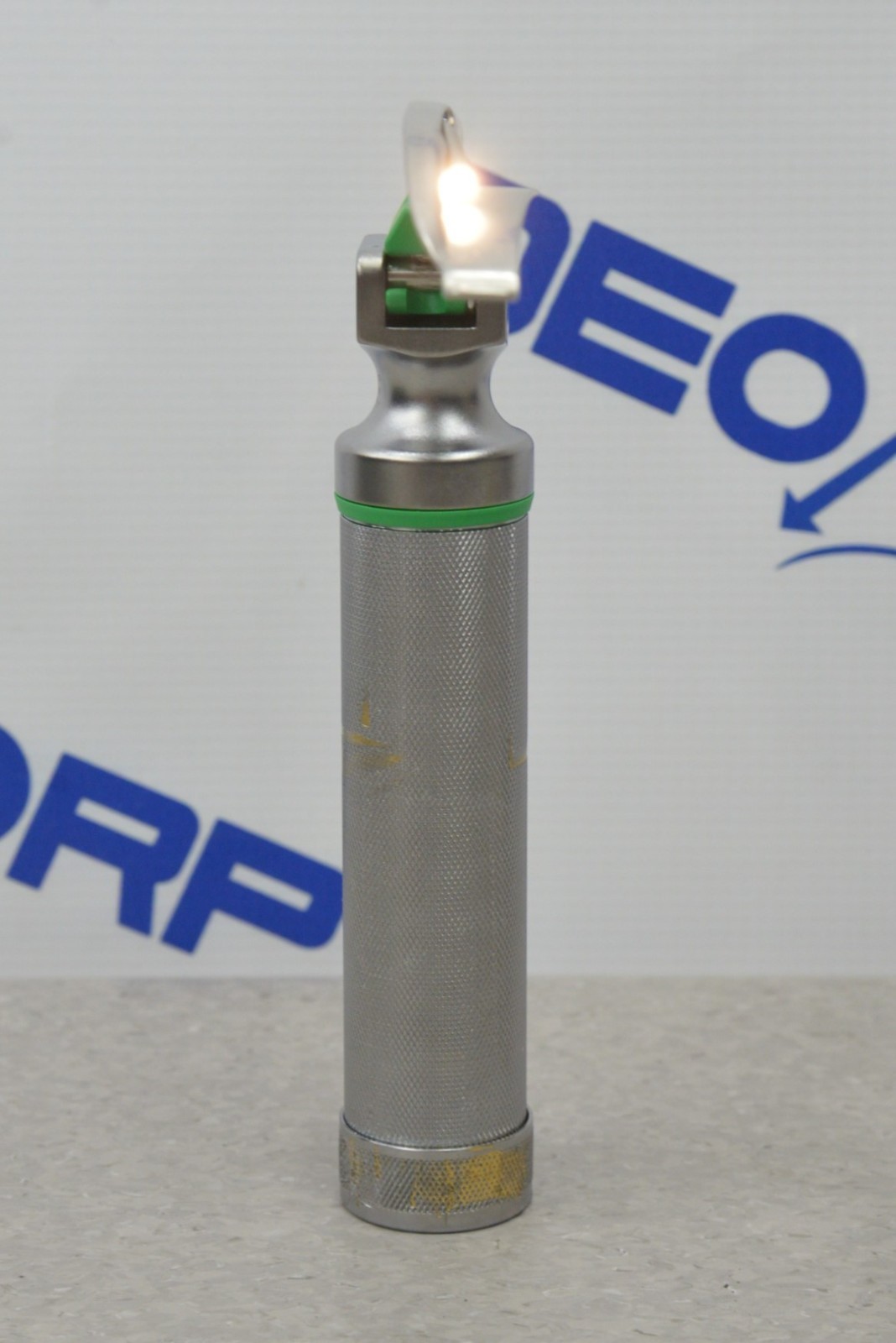 This Welch Allyn MIL5062 Comprehensive Light Kit W/ Case is in good working condition. The handles power on and light up properly. The light is visible through all the blades. There are scuff marks from previous use (see photos). The medium handle is powered by 2 C batteries, the pediatric handle is powered by 2 AA batteries and the penlight is powered by 2 AAA batteries, the batteries are not included. This unit comes with a 30 day satisfaction guarantee. Includes everything in the pictures and nothing else.